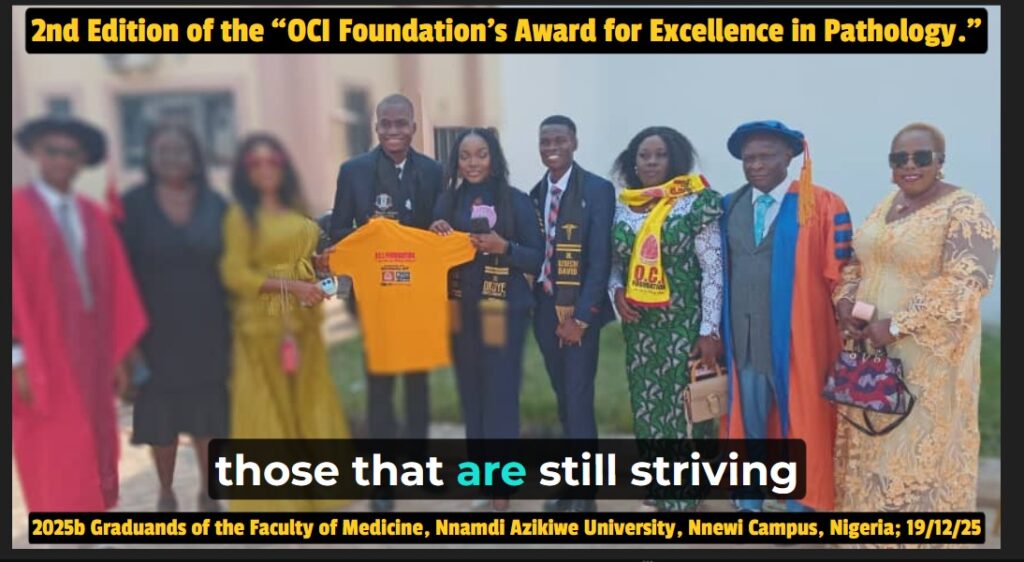 December 19, 2025: The OCI Foundation International continues to honour its pledge to honour the top three performers in the Pathology subject, a course taken as part of the 3rd MBBS professional medical examination at the Nnamdi Azikiwe University (NAU) Medical School, Nnewi Campus, Nigeria.